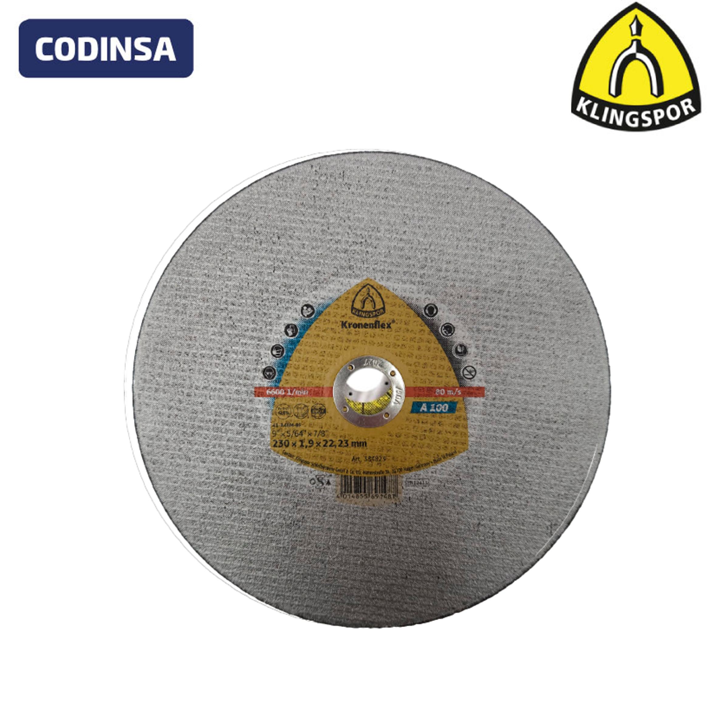 Disco de Corte Klingspor 9″ para esmeriles de tamaño grande (9”). Su formulación abrasiva permite una remoción de material rápida y eficiente.