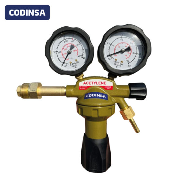 Regulador de Acetileno 20 PSI es un regulador para utilizar en cilindros de acetileno que tengan la conexión DIN 12 (R 3/4“), hilo derecho. Cuenta con dos relojes, uno para regular la presión de salida y el otro para marcar la presión a la que está cargado el cilindro.